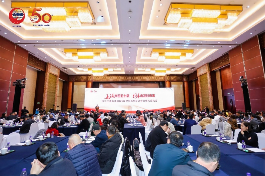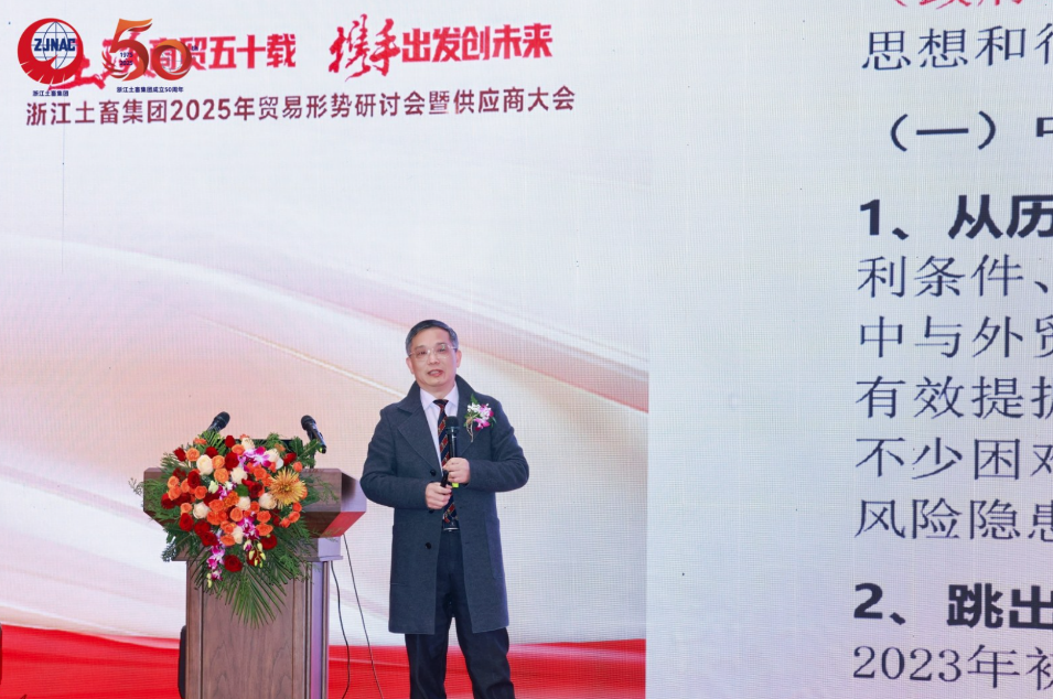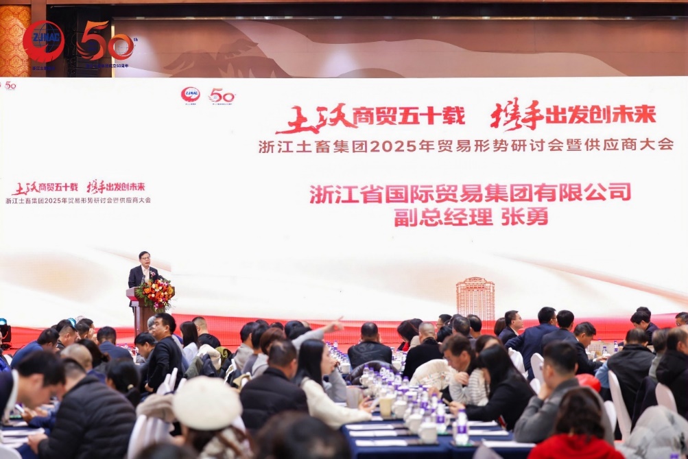 1月8日,浙江土畜在杭州舉辦2025年貿(mào)易形勢研討會暨供應(yīng)商大會,來自全國149家企業(yè)的300余名供應(yīng)商和業(yè)務(wù)員代表們相聚共商未來新發(fā)展。杭州海關(guān)原二級關(guān)務(wù)監(jiān)督、二級巡視員陸海生,省國貿(mào)集團(tuán)黨委委員、副總經(jīng)理張勇,商貿(mào)部相關(guān)負(fù)責(zé)人應(yīng)邀出席,公司領(lǐng)導(dǎo)班子、各部室參加大會。