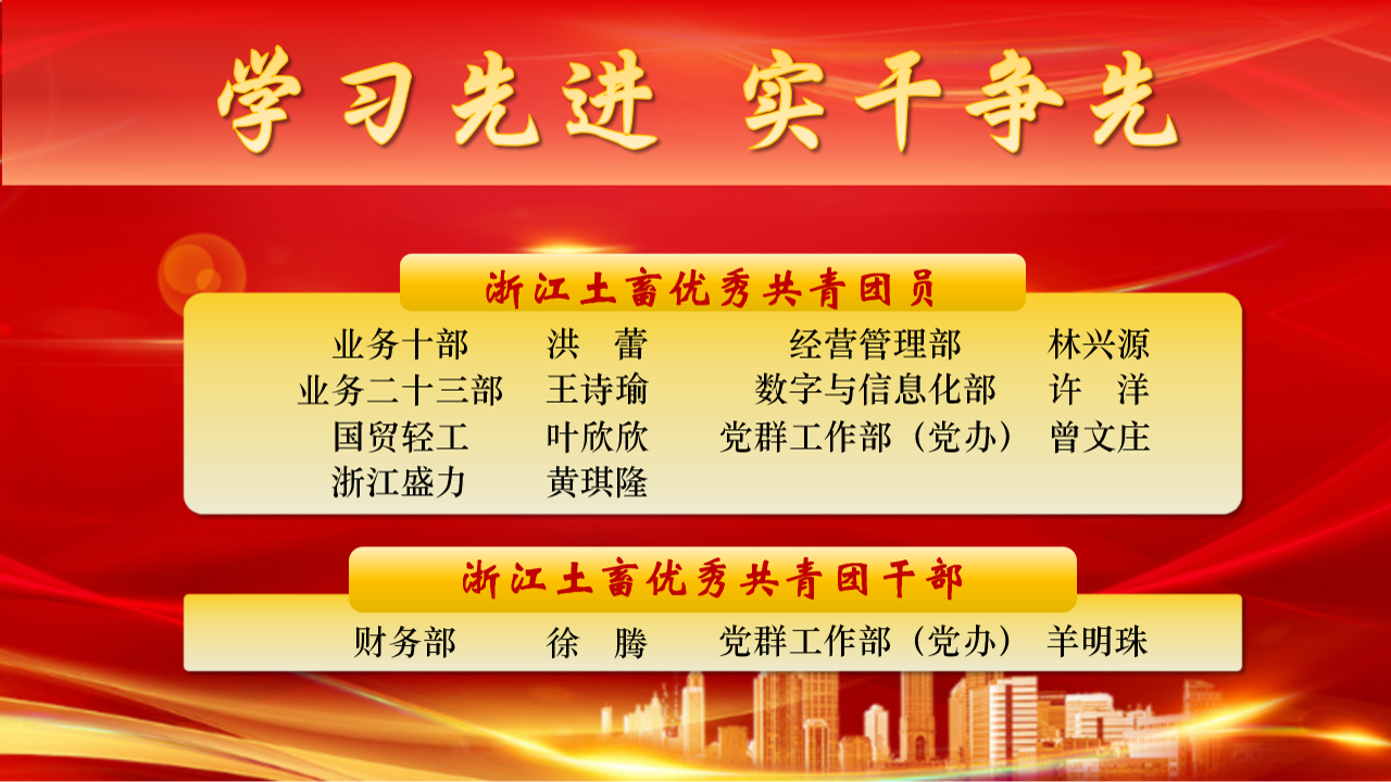 為表彰先進(jìn)、樹立榜樣,激勵(lì)公司各級(jí)團(tuán)組織和廣大團(tuán)員青年比學(xué)趕超、奮勇爭(zhēng)先,浙江土畜團(tuán)委決定,對(duì)2024年度優(yōu)秀共青團(tuán)員、優(yōu)秀共青團(tuán)干部予以表彰。希望各級(jí)團(tuán)組織和團(tuán)員青年,要以受表彰的先進(jìn)典型為榜樣,學(xué)習(xí)他們對(duì)黨忠誠(chéng)、積極向上的政治本色,學(xué)習(xí)他們敢挑重?fù)?dān)、沖鋒在前的硬核擔(dān)當(dāng),學(xué)習(xí)他們立足一線、創(chuàng)先爭(zhēng)優(yōu)的務(wù)實(shí)作風(fēng),學(xué)習(xí)他們遵規(guī)守紀(jì)、積極作為的職業(yè)操守。要大力傳承和發(fā)揚(yáng)土畜人“實(shí)干”的優(yōu)良傳統(tǒng),在深度融入共同富裕、開放強(qiáng)省等重大戰(zhàn)略中加快打造“國(guó)際供應(yīng)鏈服務(wù)價(jià)值創(chuàng)造者”,貢獻(xiàn)更多青春力量。