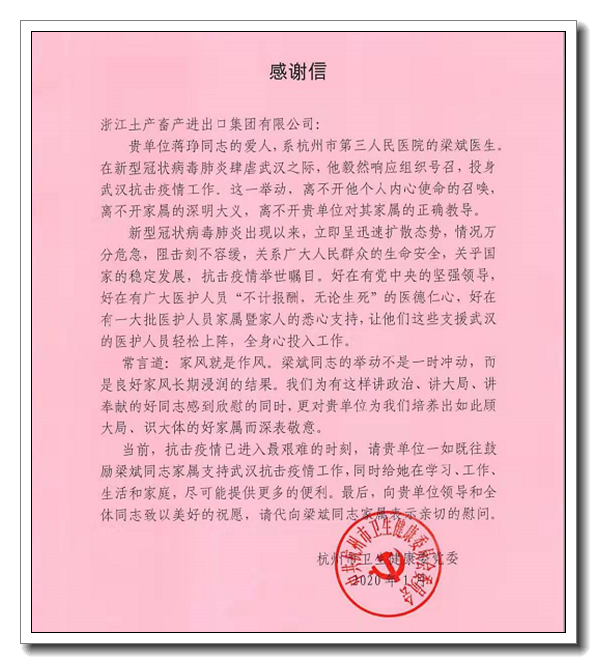 辦公室蔣琤同志舍小家顧大家,鼓勵(lì)丈夫、杭州市第三人民醫(yī)院的梁斌醫(yī)生積極響應(yīng)組織號(hào)召,趕赴武漢投身到抗擊疫情的戰(zhàn)斗中去,得到了杭州市衛(wèi)健委的高度贊揚(yáng)。