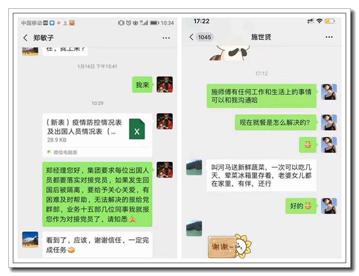 在疫情防控升級的第一時間,各支部就積極響應(yīng)黨委號召,組織黨員關(guān)心關(guān)愛疫情嚴(yán)重地區(qū)的員工健康和生活情況。目前公司43位疫情嚴(yán)重地區(qū)員工、40位國外返回人員以及20位準(zhǔn)備出國人員全部落實了對接黨員,確保每一位自我隔離的員工在遇到困難時,組織能夠第一時間發(fā)現(xiàn)并給予幫助。
