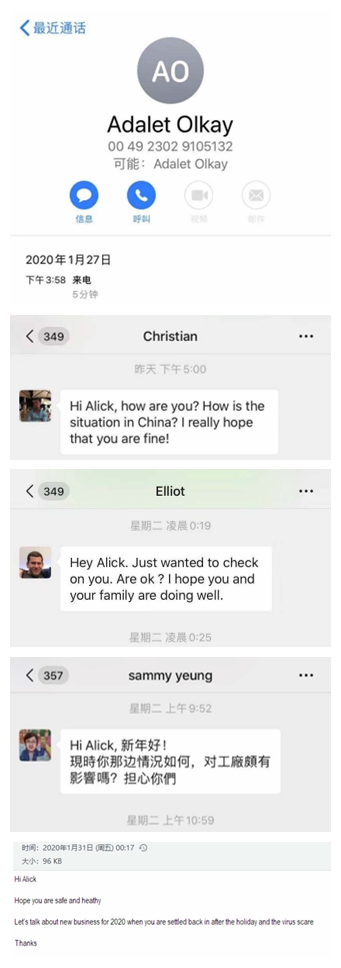 作為業(yè)務(wù)一線的業(yè)務(wù)部門,業(yè)務(wù)六部的客戶分布在美國,德國,意大利,荷蘭等國家,在得知疫情的第一時(shí)間,各種問候的郵件就雪花片一般地飛來,因?yàn)榧倨谠诩?,業(yè)務(wù)員沒有第一時(shí)間看到郵件,客人就通過微信,甚至直接電話前來詢問是否平安。
