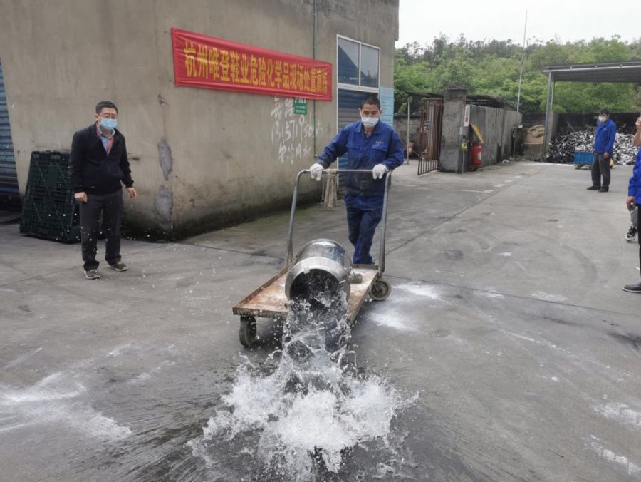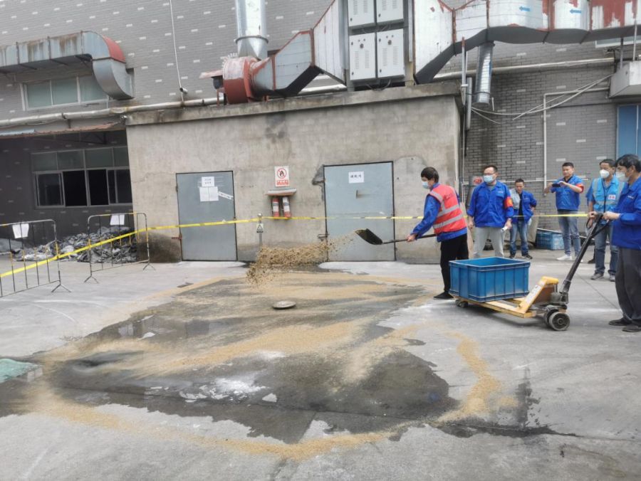 在?;沸孤┈F(xiàn)場處置環(huán)節(jié),企業(yè)模擬溶劑油在運(yùn)送過程中意外傾倒泄漏事故,參加演練人員準(zhǔn)確判斷風(fēng)向,安排人員疏散警戒,迅速用沙土對泄漏物進(jìn)行圍堵覆蓋,并讓作業(yè)員工及時(shí)用洗眼器對眼睛和臉頰進(jìn)行徹底清洗。