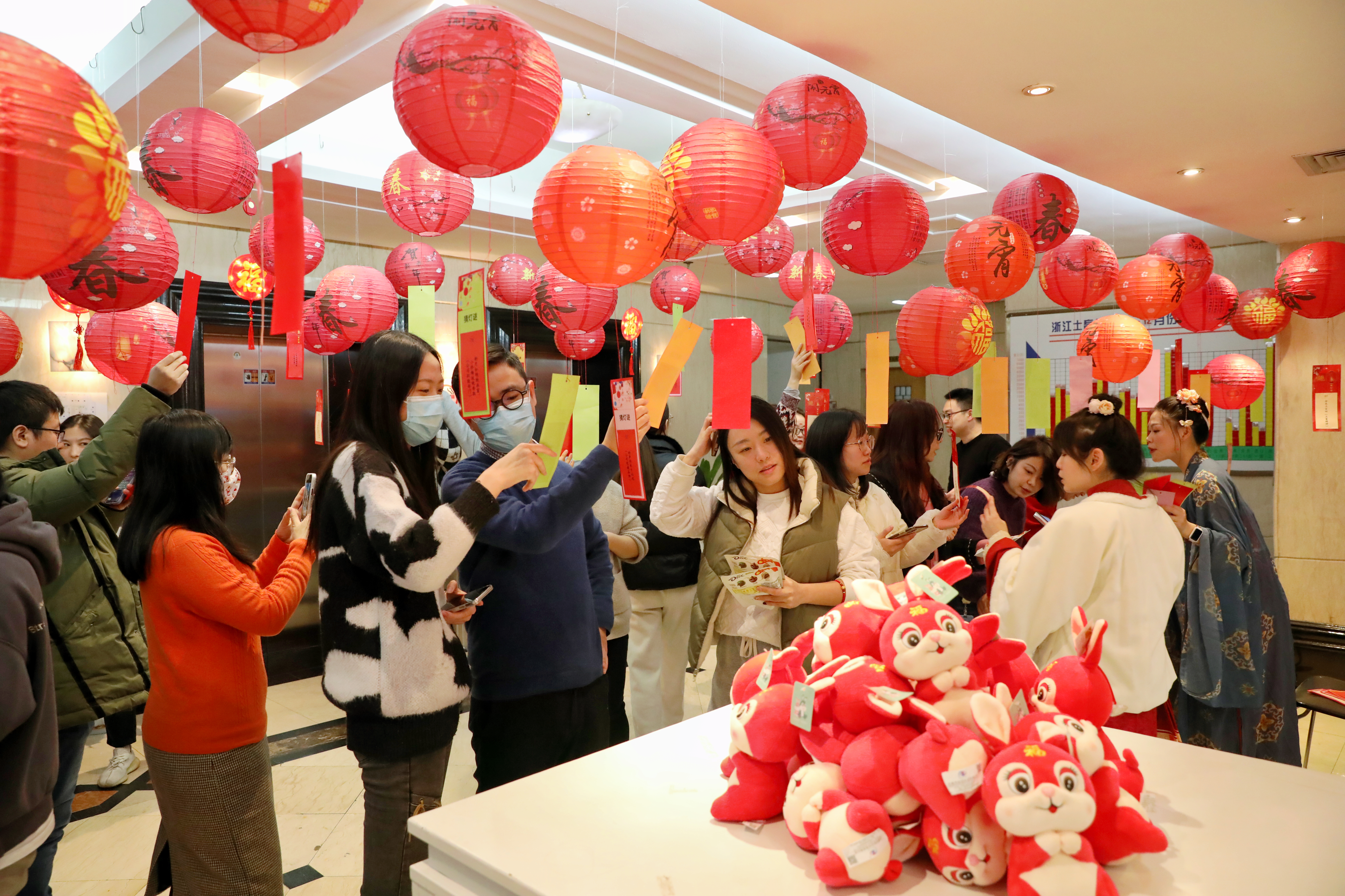 2月3日中午,浙江土畜工會組織開展元宵猜燈謎活動,公司三樓人頭攢動、熱鬧非凡,廳里錯落別致懸掛了一盞盞喜慶的紅燈籠,燈下都有五光十色的謎箋,吸引了許多員工駐足競猜,有的看著謎面低頭沉思,有的與同伴相互討論,領獎桌旁也是絡繹不絕。紅紅火火燈籠與熙熙攘攘的人群交相輝映,洋溢著濃濃的“土畜年味兒”。