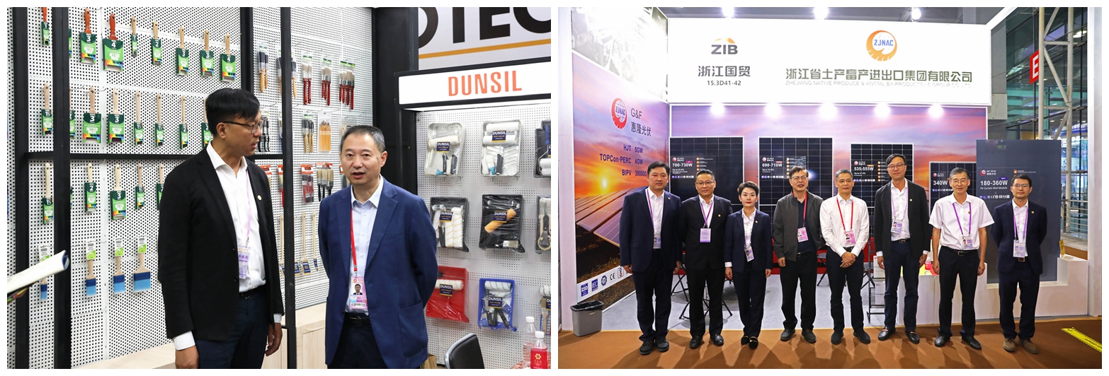 本屆廣交會浙江土畜共組織142個展位,160余名業(yè)務員參展,占浙江省交易團國貿(mào)分團近一半規(guī)模,創(chuàng)下新高,參展展品涵蓋五金工具、新能源、汽配、家居、旅游戶外、餐廚、服裝、家紡、箱包、鞋、食品等一、二、三期展會17個展區(qū)。