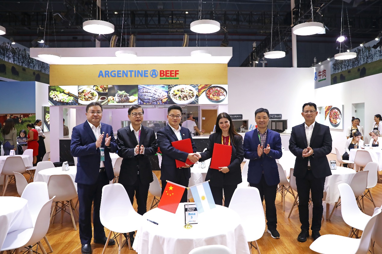 11月6日上午, 在省國貿(mào)集團(tuán)黨委書記、董事長高秉學(xué),黨委委員、副總經(jīng)理張勇的先后見證下,浙江土畜分別參加浙江省交易團(tuán)進(jìn)口采購集中簽約儀式和展館現(xiàn)場簽約,與西班牙Litera Meat, S.L.U.、阿根廷Compania Bernal S.A.公司簽下2500萬美元豬肉進(jìn)口訂單和2500萬美元牛肉進(jìn)口訂單,兩單合計(jì)5000萬美元,較上屆進(jìn)博會(huì)增長5%以上,為明年進(jìn)口肉類業(yè)務(wù)穩(wěn)定發(fā)展打下了堅(jiān)實(shí)基礎(chǔ)。