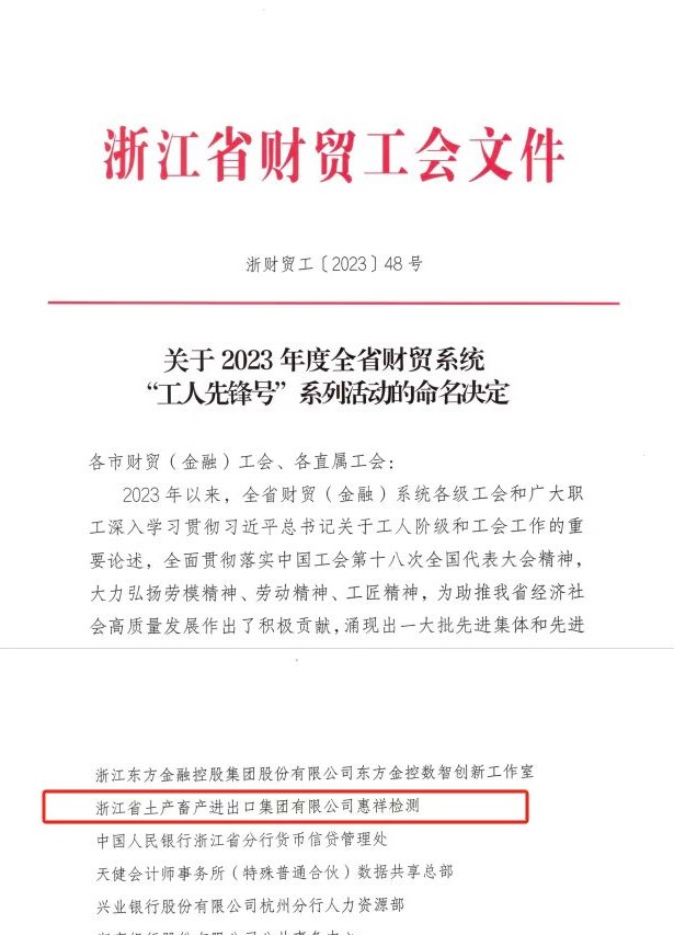 近日,浙江土畜惠祥檢測班組以其專業(yè)、優(yōu)質、高效的檢測服務,創(chuàng)新、務實、奮斗的團隊精神,榮獲2023年度浙江省財貿工會“工人先鋒號”稱號。