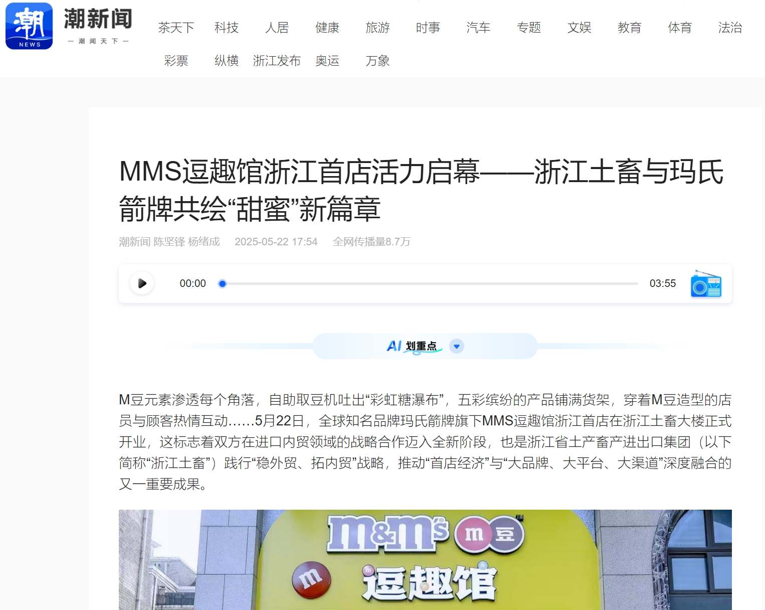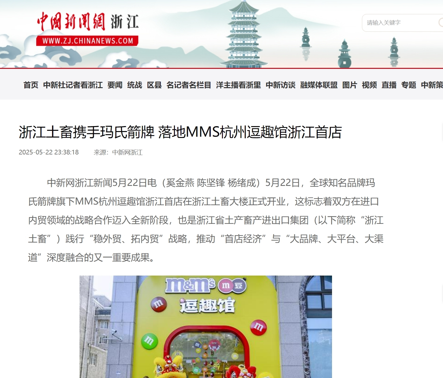 5月22日,全球知名品牌瑪氏箭牌旗下MMS逗趣館浙江首店在浙江土畜大樓正式開業(yè),這標志著雙方在進口內貿領域的戰(zhàn)略合作邁入全新階段,也是浙江省土產畜產進出口集團踐行“穩(wěn)外貿、拓內貿”戰(zhàn)略,推動“首店經濟”與“大品牌、大平臺、大渠道”深度融合的又一重要成果。MMS逗趣館浙江首店落地獲中新社浙江分社、潮新聞、今日長三角等多家媒體關注報道。
