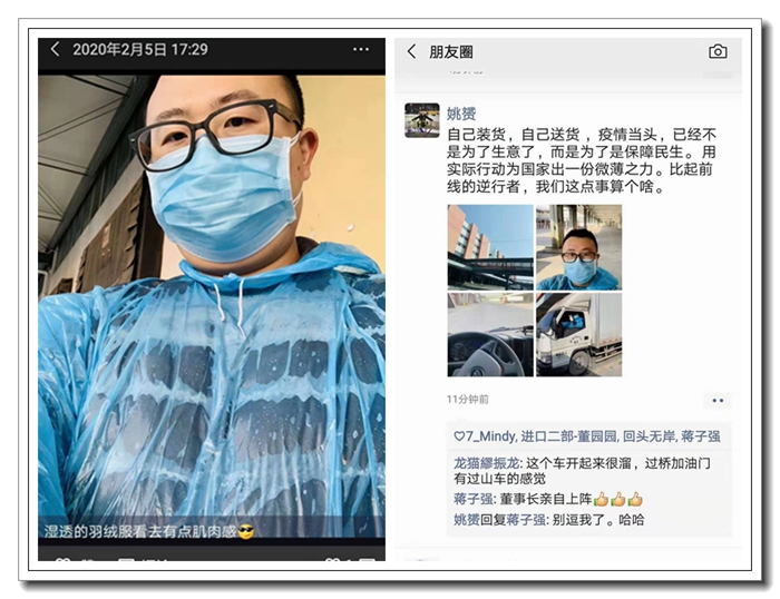 為了確保與公司長期合作的大型超市冷凍肉類貨源供應(yīng)充足,維護(hù)市場肉類產(chǎn)品的價格穩(wěn)定,省土畜進(jìn)口二部副經(jīng)理姚赟面對冷庫基地限時開放、外包運輸受限無法上路的不利局面,與同事承擔(dān)起了緊急配送的民生保障任務(wù)。整整兩車共計10噸凍肉的裝卸配送后,汗水、熱氣讓姚赟的外套和防護(hù)雨披黏在了一起,輕貓淡寫的一句“濕透的羽絨服看去有點肌肉感!”背后隱含的是土畜人為合作客戶和消費者極限服務(wù)的責(zé)任心。