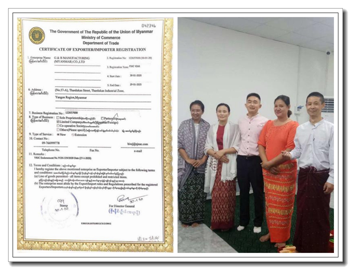 惠元緬甸工廠進(jìn)出口證書 經(jīng)營團(tuán)隊(左二總經(jīng)理汪明霞)